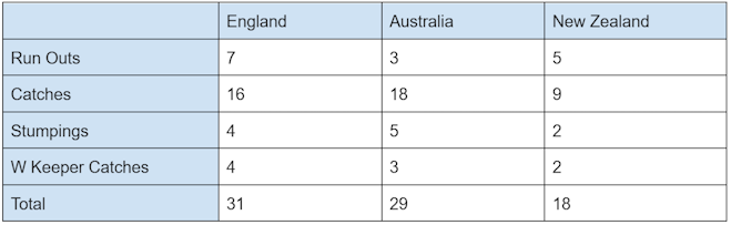 FIELDING. If we compare the top three teams, England, Australia, and ourselves in run outs, catches, stumping’s, and wicket keeper catches we get: